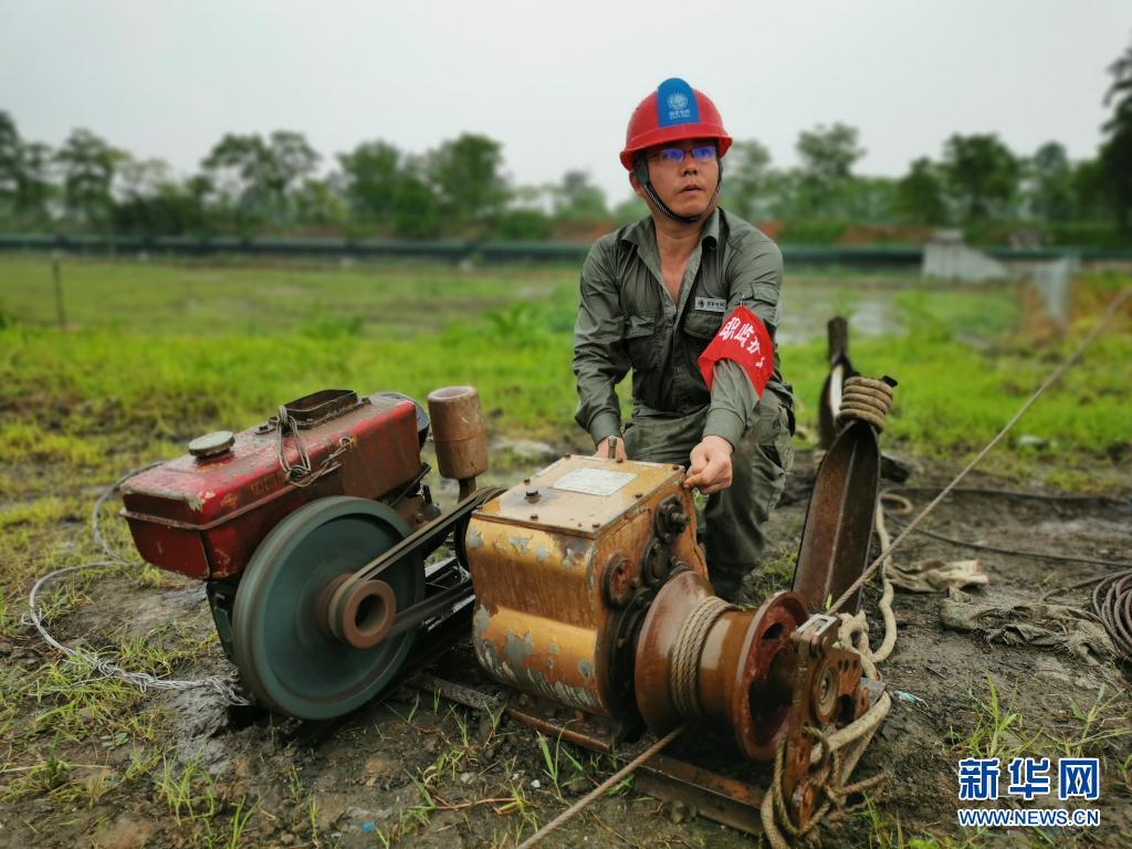 “跑山電工”黨員服務(wù)隊隊員操作機動絞磨牽引導(dǎo)線(5月3日攝)。