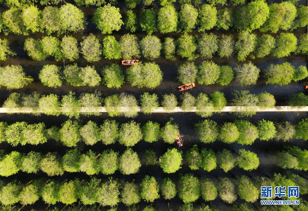 5月3日,在江蘇省揚(yáng)州市淥洋湖濕地公園,游客在水上森林劃船游玩(無人機(jī)照片)。新華社發(fā)(孟德龍 攝)