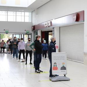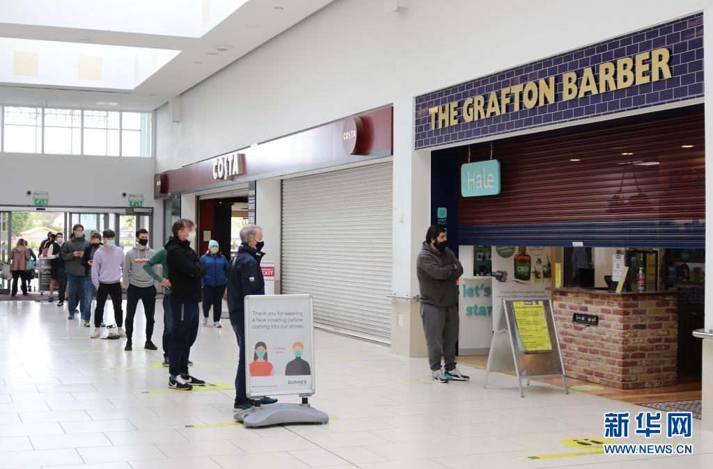 5月10日,人們在愛爾蘭首都都柏林一家重新恢復營業(yè)的理發(fā)館外排隊。