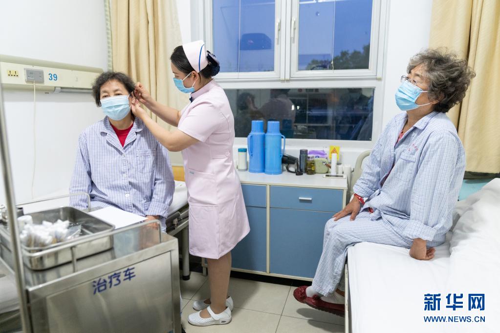 5月10日,在北京按摩醫(yī)院,病房護士為住院病人貼耳豆。