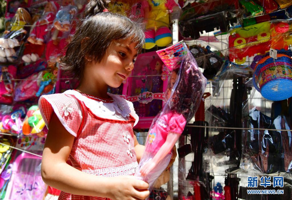 5月11日,一名女孩在敘利亞首都大馬士革的市場上拿起挑選的玩具娃娃。