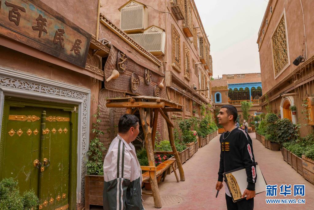 麥麥提吐爾遜江·麥麥提依明(右)和朋友在新疆喀什古城景區(qū)尋找創(chuàng)作素材(5月6日攝)。新華社記者 胡虎虎 攝