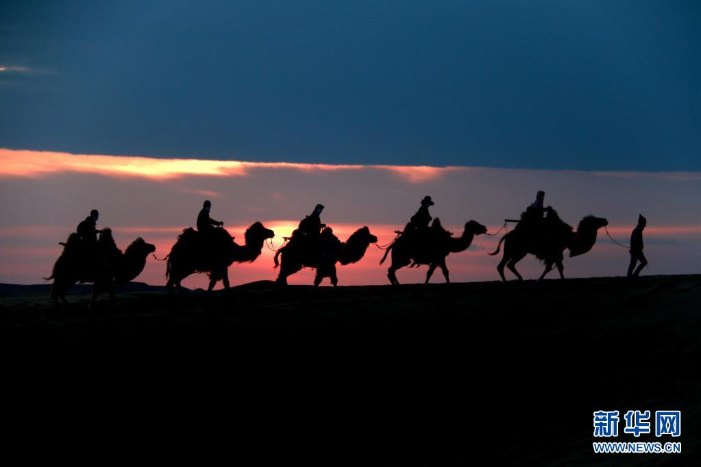 5月15日,游客騎駱駝在甘肅省敦煌市鳴沙山月牙泉景區(qū)游覽。晨光下,云彩、沙山、駝隊構(gòu)成了一幅美麗迷人的畫卷。新華社發(fā)(張曉亮 攝)