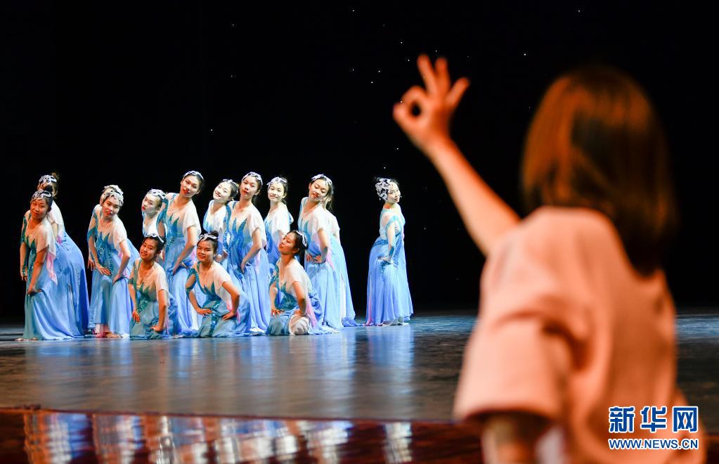 在天津理工大學(xué)的劇場里,天津市殘疾人文藝體育訓(xùn)練指導(dǎo)中心舞蹈老師韓菲用手語為學(xué)生指揮(5月10日攝)。新華社發(fā)(孫凡越攝)