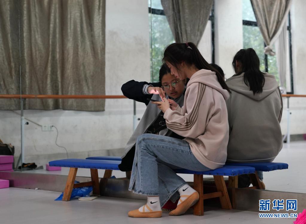 2021年5月11日,蔣張子怡(左)在學校的舞蹈房內(nèi)和同學交流舞蹈動作。