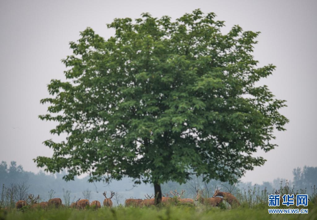 5月17日,一群麋鹿在石首麋鹿國家級自然保護區(qū)內活動。新華社記者 肖藝九 攝
