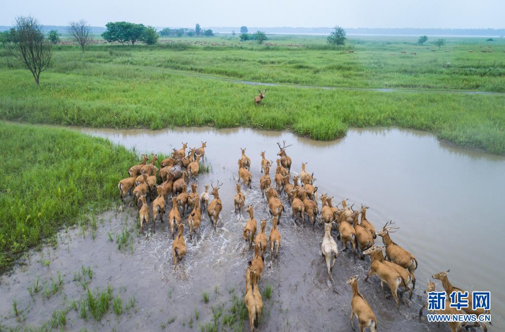 5月17日,一群麋鹿在石首麋鹿國家級自然保護(hù)區(qū)內(nèi)活動(無人機(jī)照片)。新華社記者 肖藝九 攝