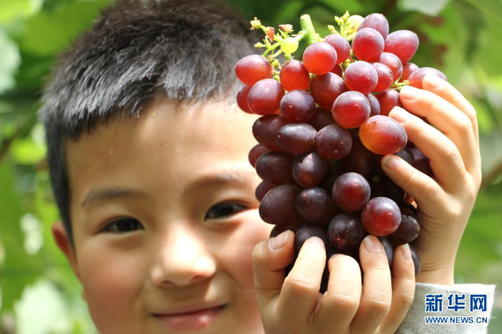 5月23日,在河北省平泉市道虎溝鄉(xiāng)雙峰社區(qū)一處設施葡萄大棚里,一名小朋友展示自己采摘的茉莉香葡萄。