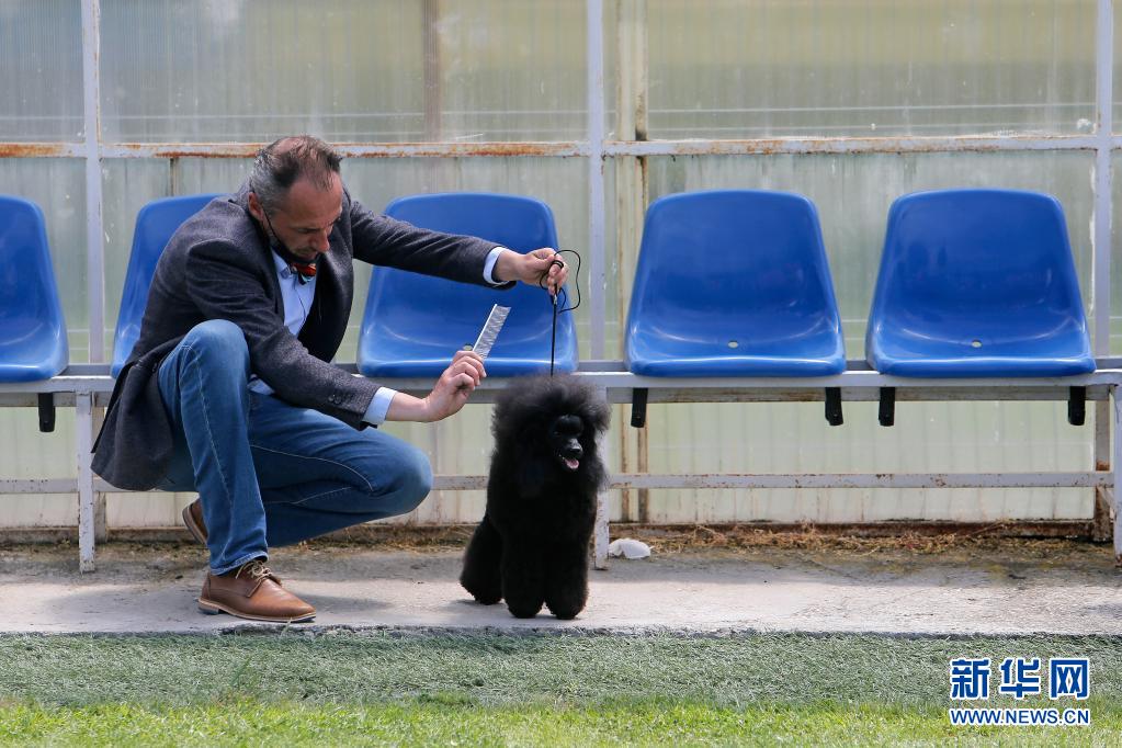 5月23日,一名男子在羅馬尼亞首都布加勒斯特為愛(ài)犬參加選美比賽做準(zhǔn)備。新華社發(fā)(克里斯泰爾攝)