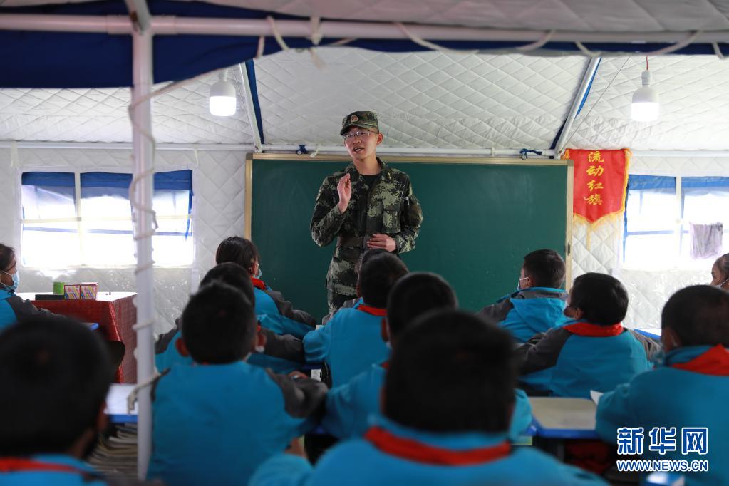 5月24日,武警青??傟牴逯ш牂C(jī)動大隊排長張國睿為花石峽鎮(zhèn)藏文中心寄宿制小學(xué)的孩子上課。新華社記者 劉芳 攝