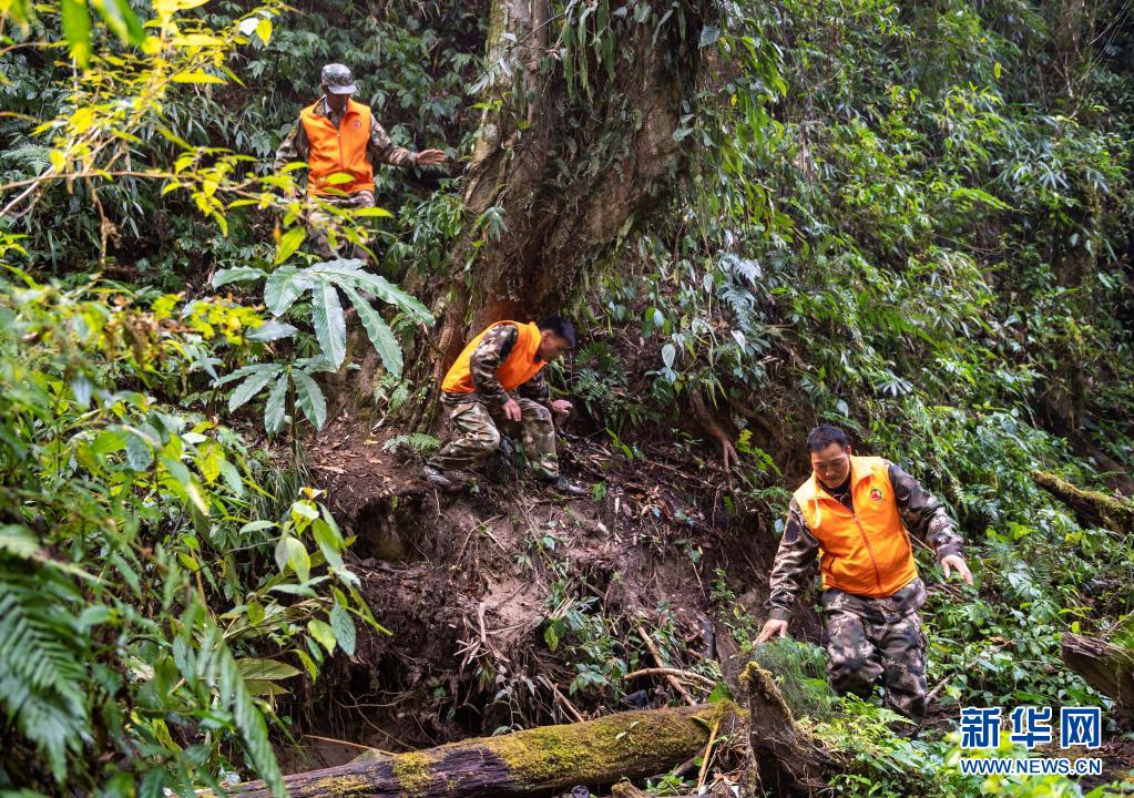 護(hù)林員楊有山(中)和同事在山間巡護(hù)(3月14日攝)。