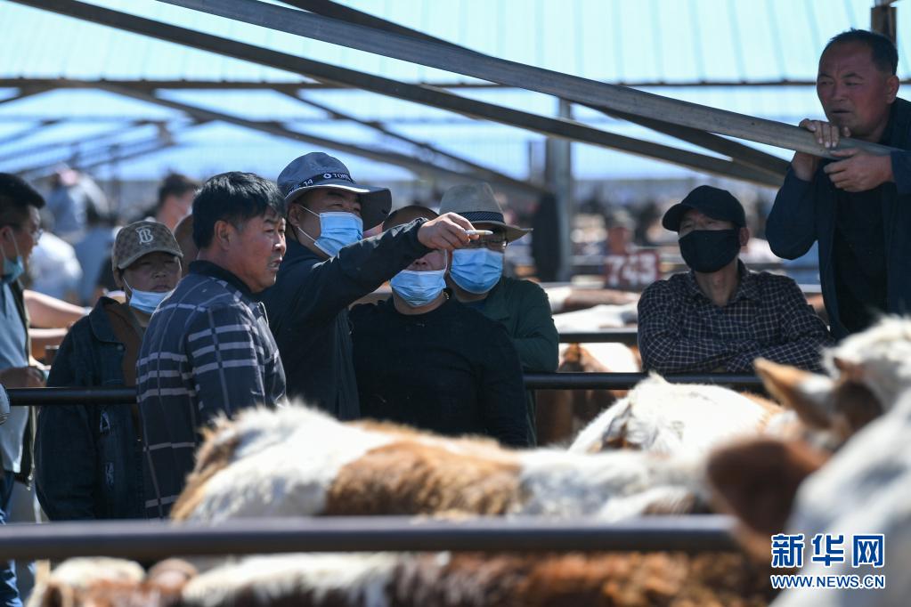 6月1日,交易者在開(kāi)魯牛市交易攤位看牛詢(xún)價(jià)。