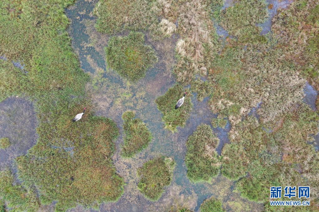這是6月2日在甘肅省甘南藏族自治州碌曲縣尕海湖拍攝的國家一級保護動物黑頸鶴(無人機照片)。