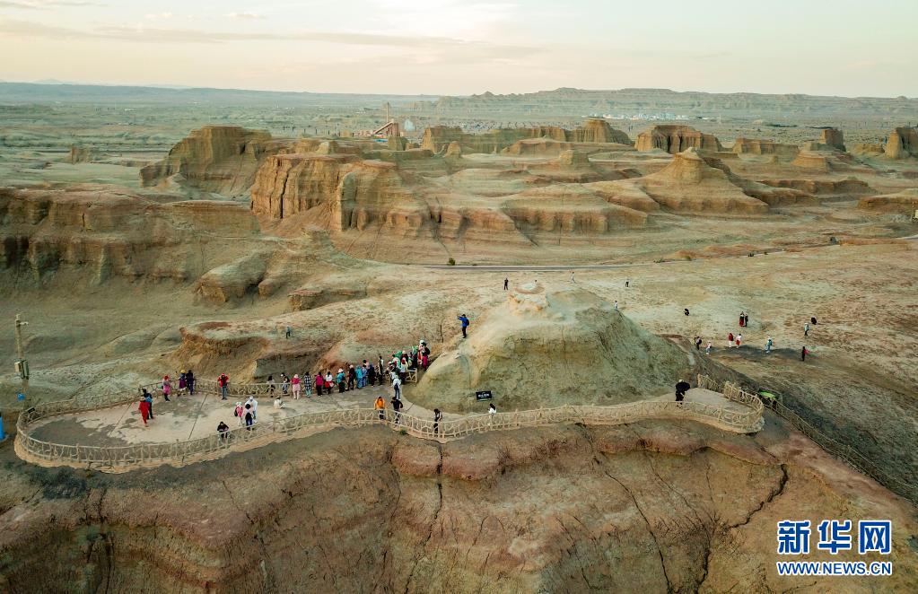 游客在新疆克拉瑪依烏爾禾世界魔鬼城景區(qū)內(nèi)欣賞日落(6月21日攝,無人機照片)。