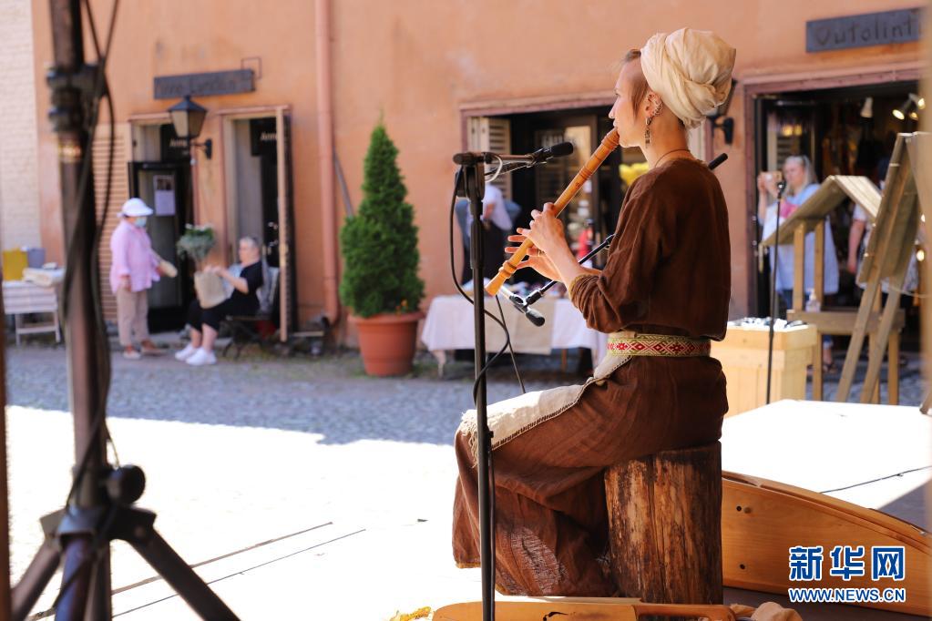 7月1日,一名身著中世紀(jì)風(fēng)格服裝的表演者在芬蘭圖爾庫舉行的“中世紀(jì)市集”上演奏。
