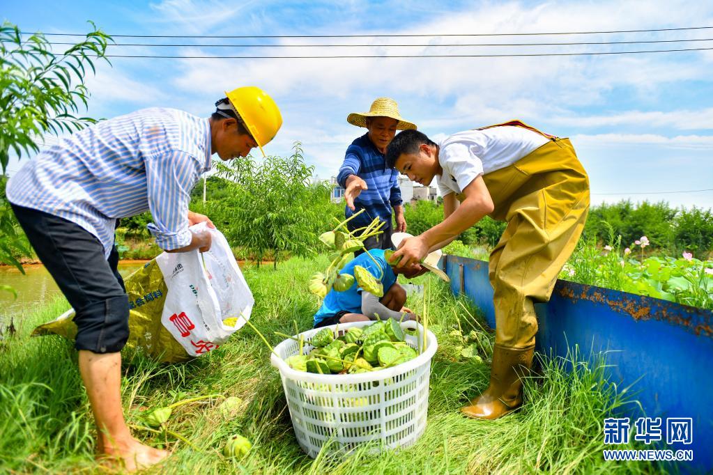 7月11日,在湖南省湘潭市雨湖區(qū)姜畬鎮(zhèn)聯(lián)映村,蓮農(nóng)將采摘好的蓮蓬裝筐。新華社記者 陳澤國(guó) 攝