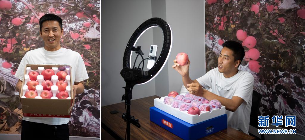 拼版照片:左圖為郭鋒杰展示山西省吉縣產(chǎn)的蘋果;右圖為郭鋒杰通過(guò)網(wǎng)絡(luò)直播銷售蘋果(7月9日攝)。今年32歲的郭鋒杰是吉縣古賢村人,常年在外從事建筑行業(yè)。吉縣有“蘋果之鄉(xiāng)”的美譽(yù),看到吉縣蘋果在農(nóng)村電商領(lǐng)域的發(fā)展?jié)摿?,郭鋒杰經(jīng)過(guò)長(zhǎng)期考察后,選擇返鄉(xiāng)創(chuàng)業(yè)。返鄉(xiāng)后,他忙著和果農(nóng)洽談合作,聯(lián)系各大商超,自己也開(kāi)起了網(wǎng)店,做起了“主播”。