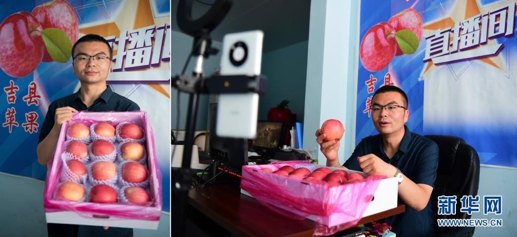 拼版照片:左圖為郭豐瑞展示山西省吉縣產(chǎn)的蘋果;右圖為郭豐瑞通過(guò)網(wǎng)絡(luò)直播介紹蘋果(7月9日攝)。今年31歲的郭豐瑞是吉縣南村人,曾在北京打工的他看到農(nóng)村電商的巨大潛力后,于2013年返鄉(xiāng)創(chuàng)業(yè)。2014年,郭豐瑞成立了合作社,同時(shí)開始線上銷售蘋果。隨著網(wǎng)絡(luò)直播熱潮的興起,郭豐瑞開始通過(guò)各個(gè)直播平臺(tái)宣傳家鄉(xiāng)的優(yōu)質(zhì)蘋果。