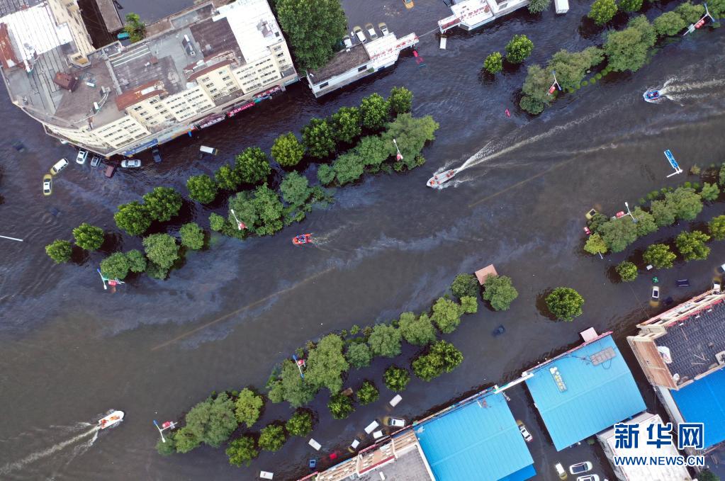 7月26日,在河南省衛(wèi)輝市,救援船只穿梭于城區(qū)內(nèi)(無人機照片)。