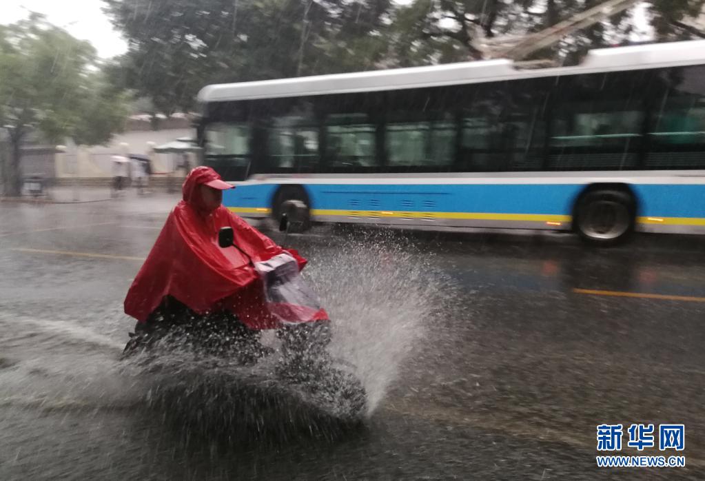 7月27日,在北京西單附近,騎行者經(jīng)過(guò)一處公交車站(手機(jī)拍攝)。