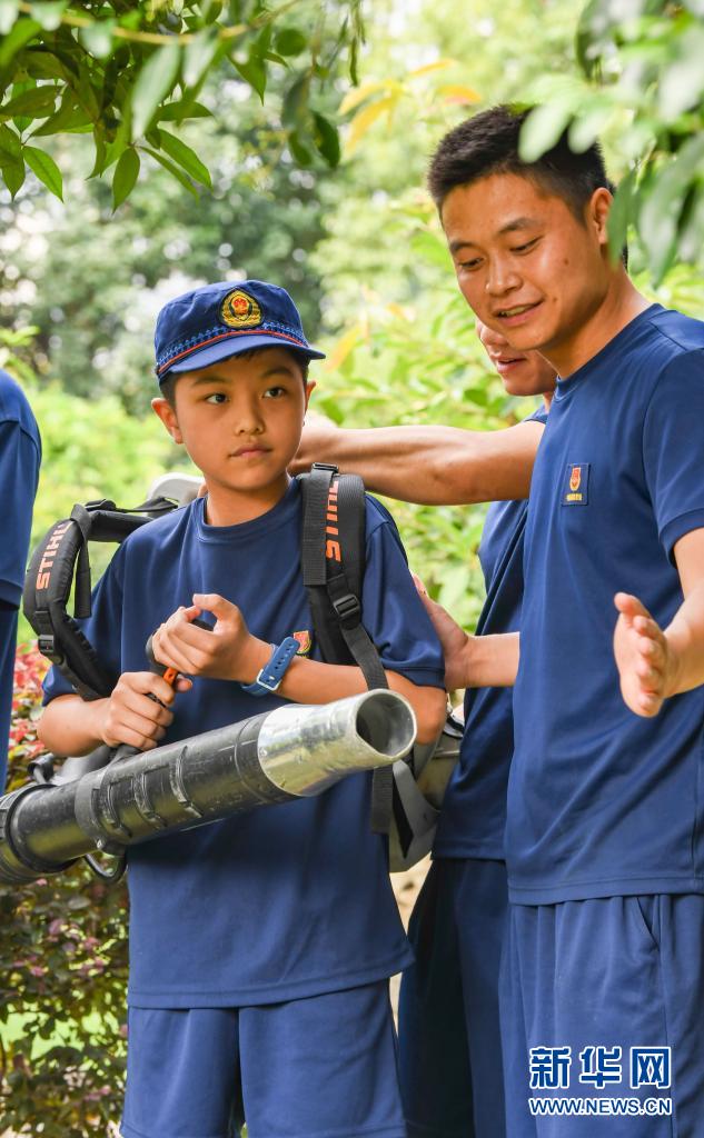 在四川省森林消防總隊(duì)特勤大隊(duì),消防員王波平帶著一名孩子在體驗(yàn)風(fēng)力滅火機(jī)(7月27日攝)。