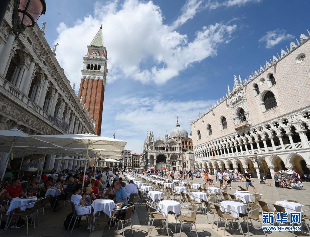 8月3日,游客在意大利威尼斯一處餐廳的戶外就餐區(qū)消費。