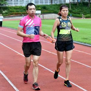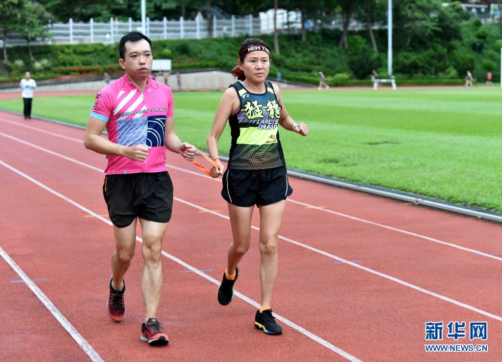 猛龍長(zhǎng)跑隊(duì)視聽障跑手蔡浩良(左)與隊(duì)友一起練跑(7月29日攝)。新華社記者 盧炳輝 攝