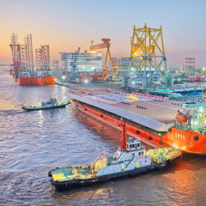 12月9日,厦金大桥(厦门段)大节段钢箱梁在江苏南通振华重装码头发运(无人机照片)。