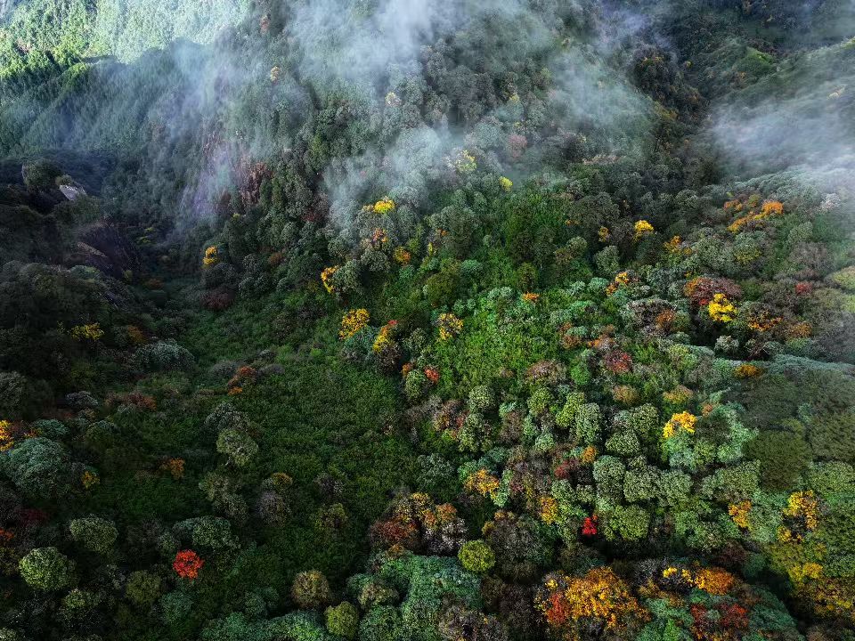初冬時節(jié),走進(jìn)云南省騰沖市猴橋鎮(zhèn)輪馬村粉竹壩,層林盡染,五彩斑斕,彩色山林如巨幅油畫鋪展于群山之間。薄霧繚繞中,山林靜謐而幽遠(yuǎn),構(gòu)成一幅濃墨重彩的冬日畫卷。