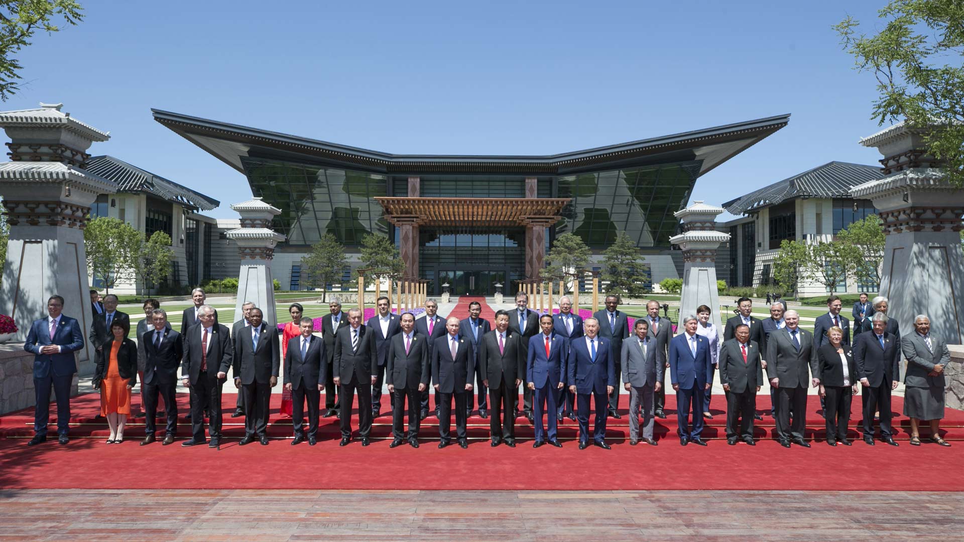 5月15日,“一帶一路”國際合作高峰論壇圓桌峰會在北京雁棲湖國際會議中心舉行,國家主席習近平主持會議并致開幕辭。這是第一階段會議結束后,習近平同外方代表團團長及嘉賓在雁棲湖國際會議中心前合影。新華社記者 姚大偉 攝