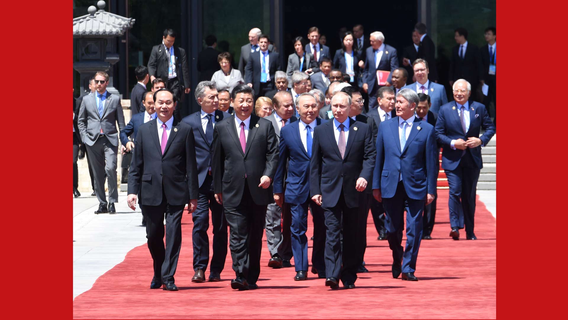 5月15日,“一帶一路”國際合作高峰論壇圓桌峰會在北京雁棲湖國際會議中心舉行,國家主席習近平主持會議并致開幕辭。這是第一階段會議結束后,習近平同外方代表團團長及嘉賓步出雁棲湖國際會議中心。新華社記者 饒愛民 攝