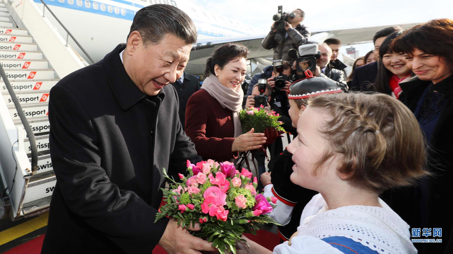 1月15日,國(guó)家主席習(xí)近平乘專機(jī)抵達(dá)蘇黎世,開始對(duì)瑞士聯(lián)邦進(jìn)行國(guó)事訪問(wèn)。這是當(dāng)?shù)貎和蛄?xí)近平和夫人彭麗媛獻(xiàn)上鮮花。新華社記者蘭紅光攝2017-01-16