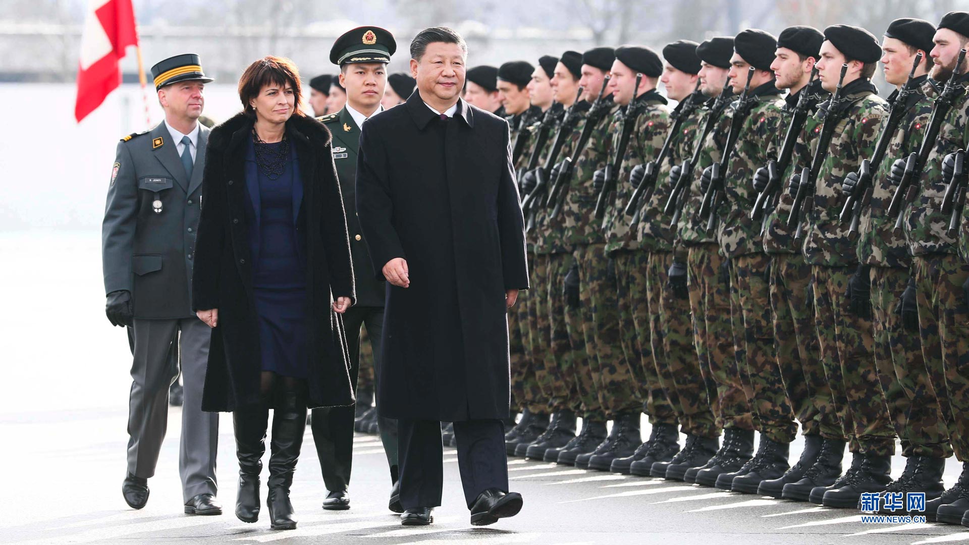 1月15日,國(guó)家主席習(xí)近平乘專機(jī)抵達(dá)蘇黎世,開始對(duì)瑞士聯(lián)邦進(jìn)行國(guó)事訪問(wèn)。這是習(xí)近平在瑞士聯(lián)邦主席洛伊特哈德陪同下檢閱儀仗隊(duì)。新華社記者蘭紅光攝2017-01-16