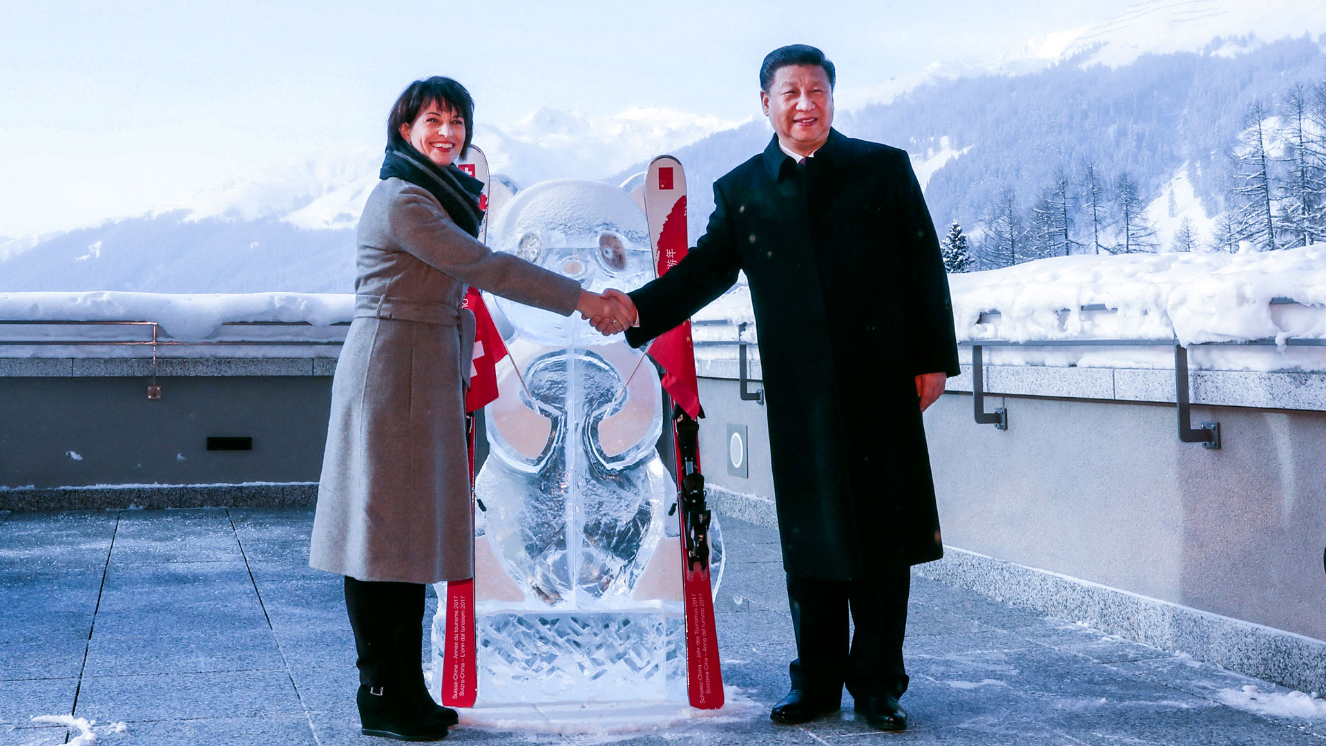 1月17日,國(guó)家主席習(xí)近平同瑞士聯(lián)邦主席洛伊特哈德在達(dá)沃斯共同啟動(dòng)中瑞旅游年。兩國(guó)元首在熊貓冰雕像和印有中瑞兩國(guó)國(guó)旗及“中瑞旅游年”字樣的滑雪板旁合影留念。新華社記者 丁林 攝2017-01-18