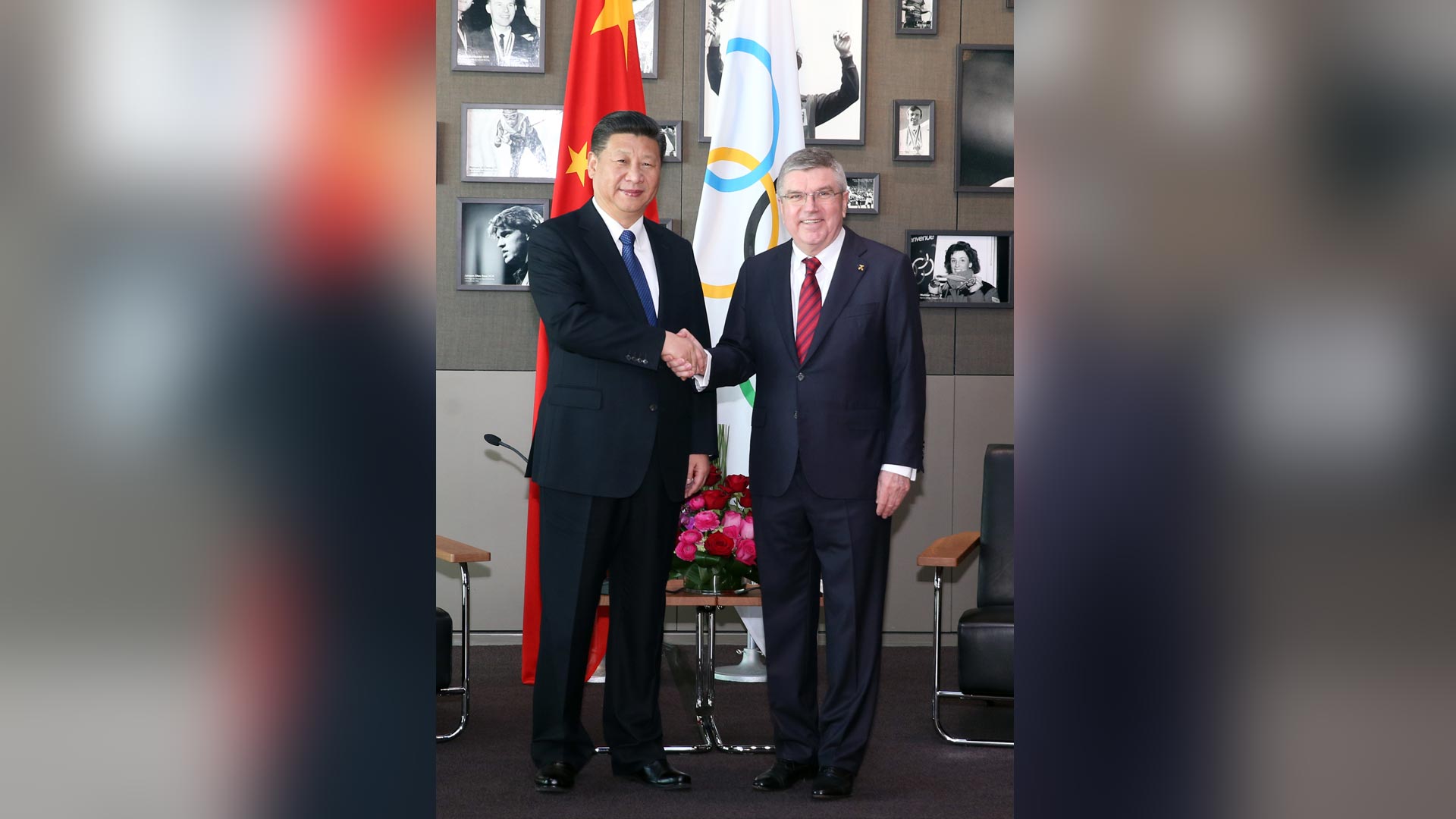 1月18日,國(guó)家主席習(xí)近平在瑞士洛桑國(guó)際奧林匹克博物館會(huì)見國(guó)際奧林匹克委員會(huì)主席巴赫。這是習(xí)近平與巴赫在巴赫作為擊劍運(yùn)動(dòng)員參加奧運(yùn)會(huì)的照片前合影。新華社記者 蘭紅光 攝2017-01-19