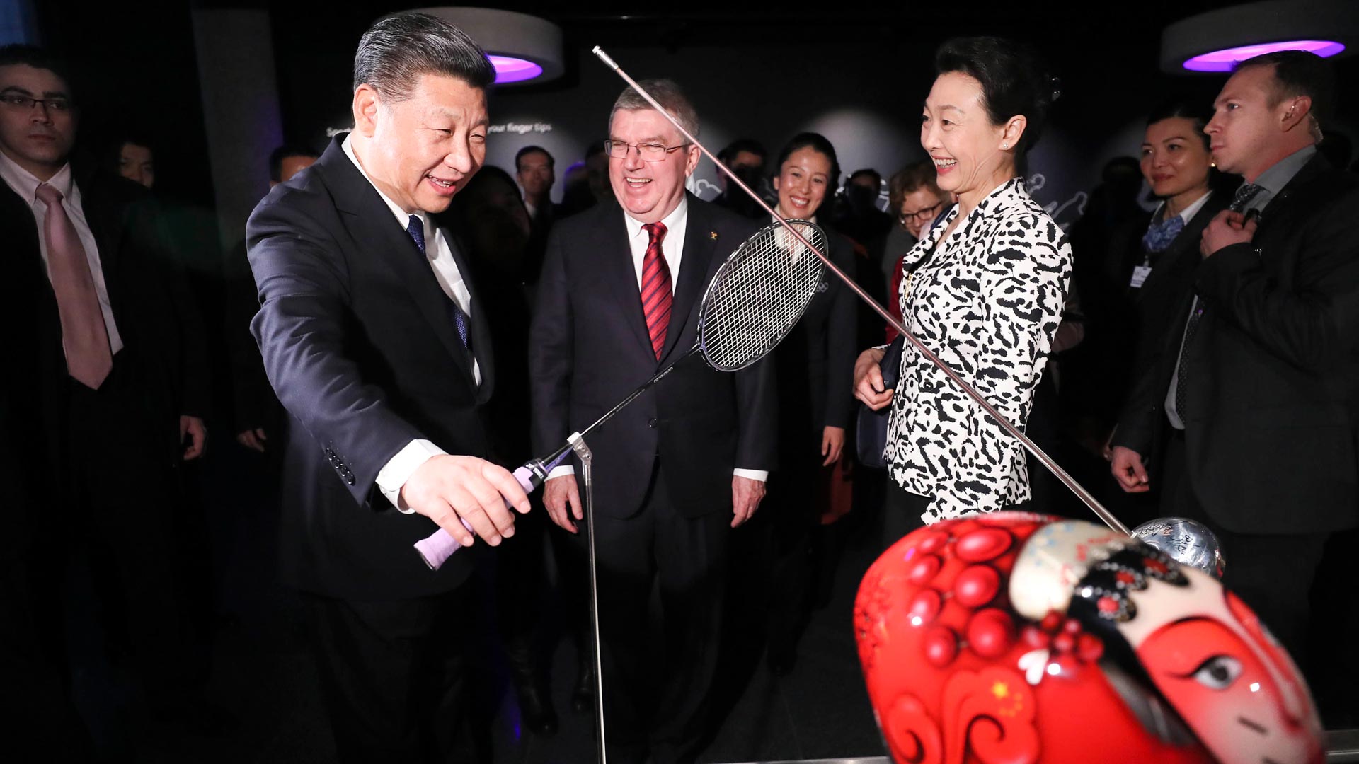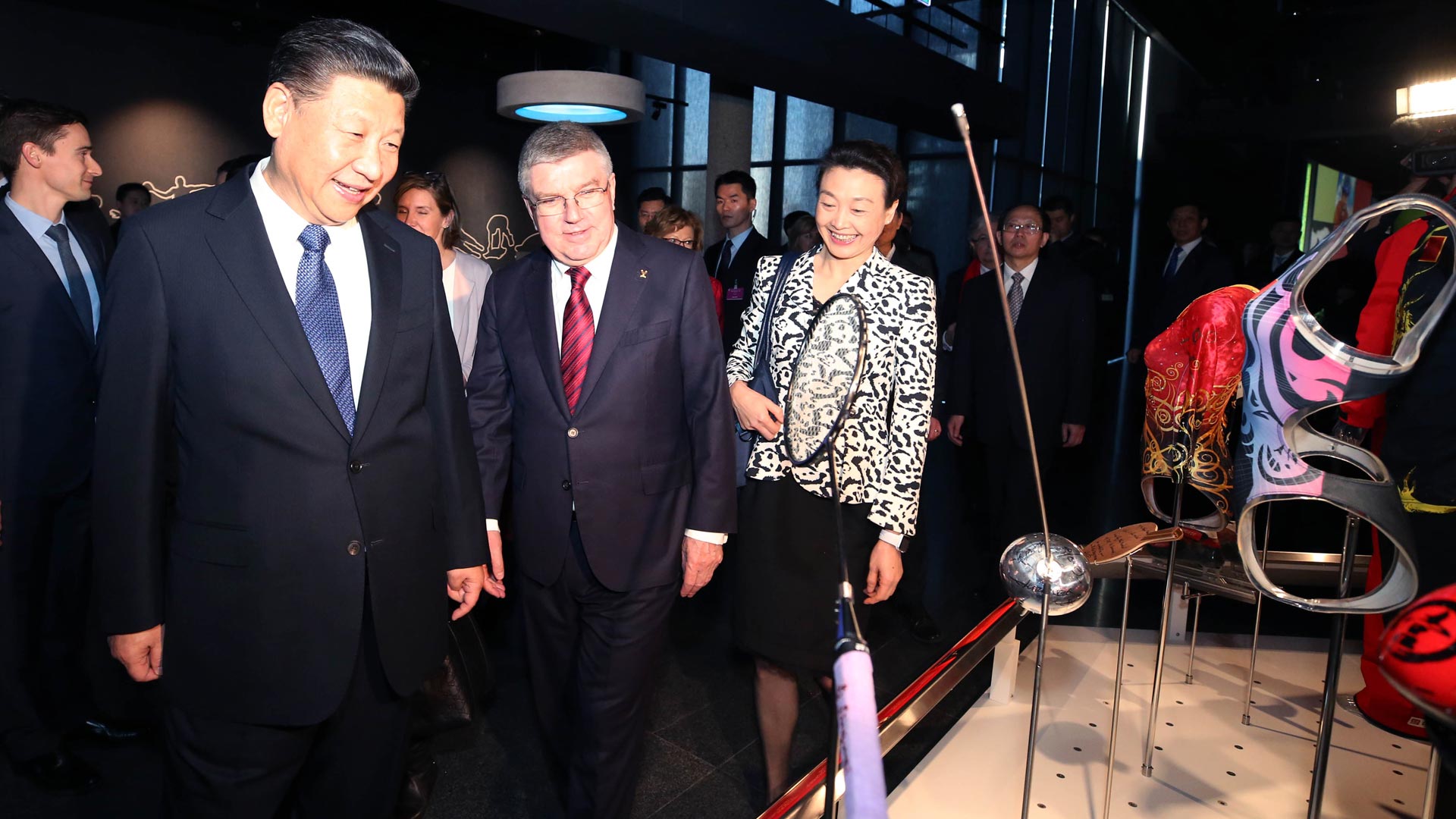 1月18日,國(guó)家主席習(xí)近平在瑞士洛桑國(guó)際奧林匹克博物館會(huì)見國(guó)際奧林匹克委員會(huì)主席巴赫。這是習(xí)近平在巴赫陪同下,參觀羽毛球世界冠軍李玲蔚用過(guò)的球拍。新華社記者 蘭紅光 攝2017-01-19