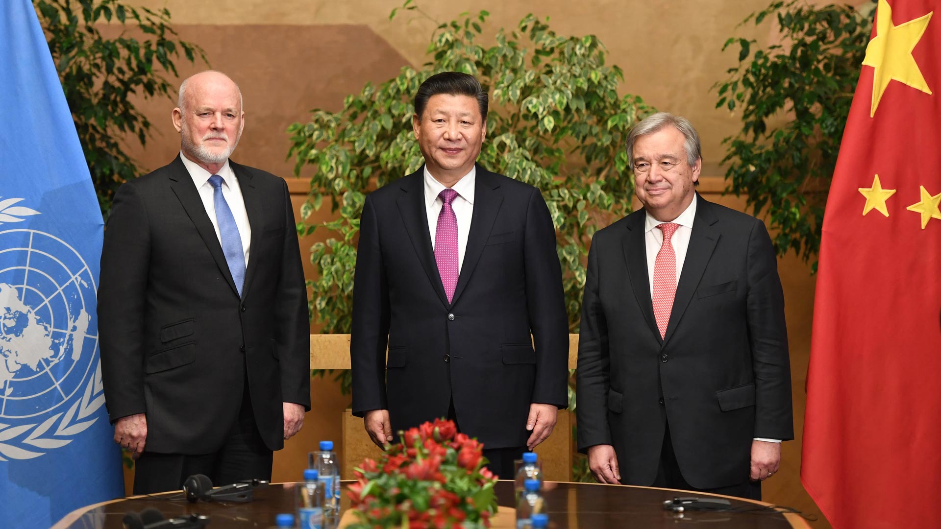 1月18日,國(guó)家主席習(xí)近平在瑞士日內(nèi)瓦萬(wàn)國(guó)宮會(huì)見第71屆聯(lián)合國(guó)大會(huì)主席湯姆森和聯(lián)合國(guó)秘書長(zhǎng)古特雷斯。 新華社記者 張鐸 攝2017-01-19