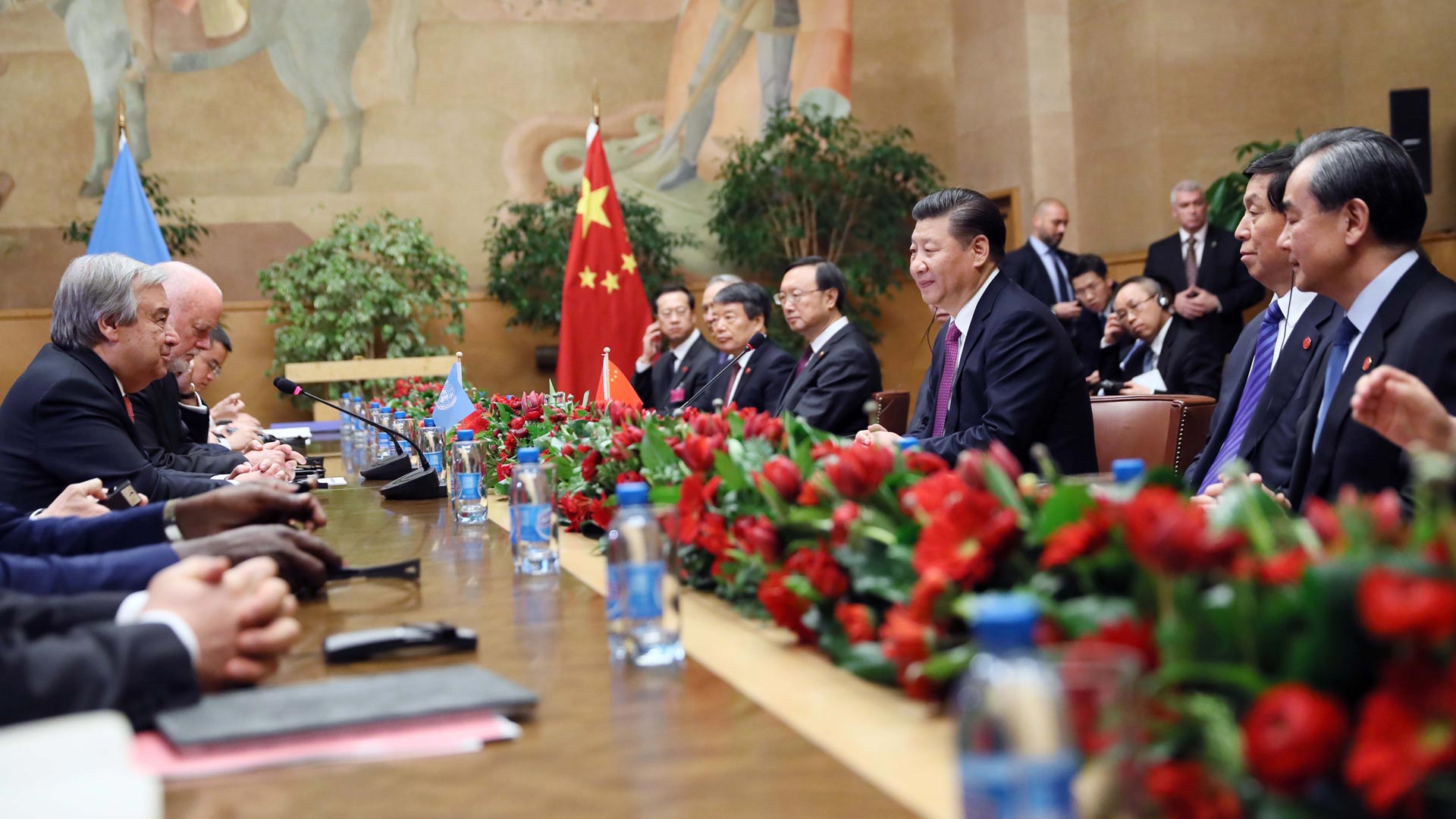 1月18日,國(guó)家主席習(xí)近平在瑞士日內(nèi)瓦萬(wàn)國(guó)宮會(huì)見第71屆聯(lián)合國(guó)大會(huì)主席湯姆森和聯(lián)合國(guó)秘書長(zhǎng)古特雷斯。 新華社記者 蘭紅光 攝2017-01-19
