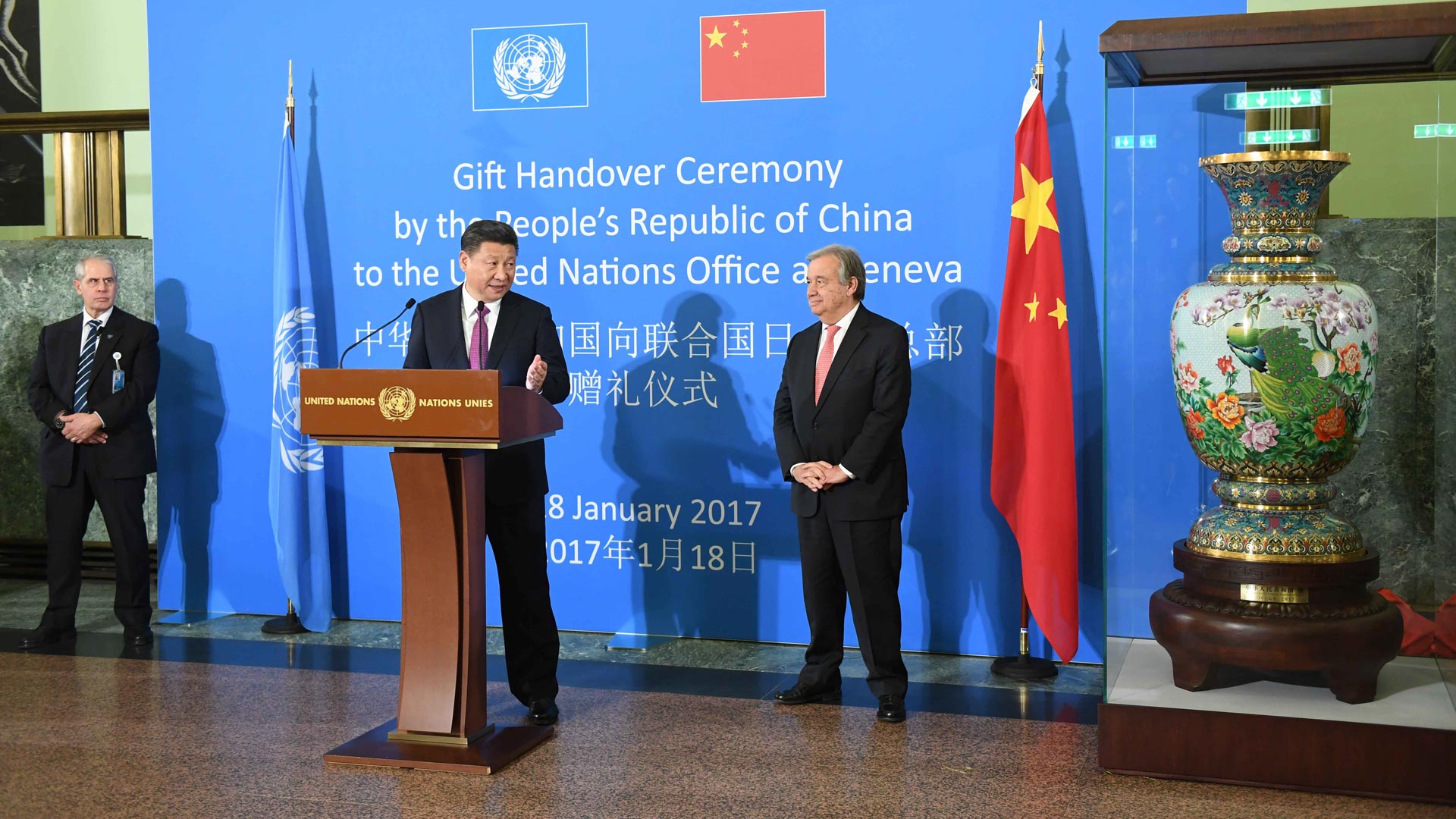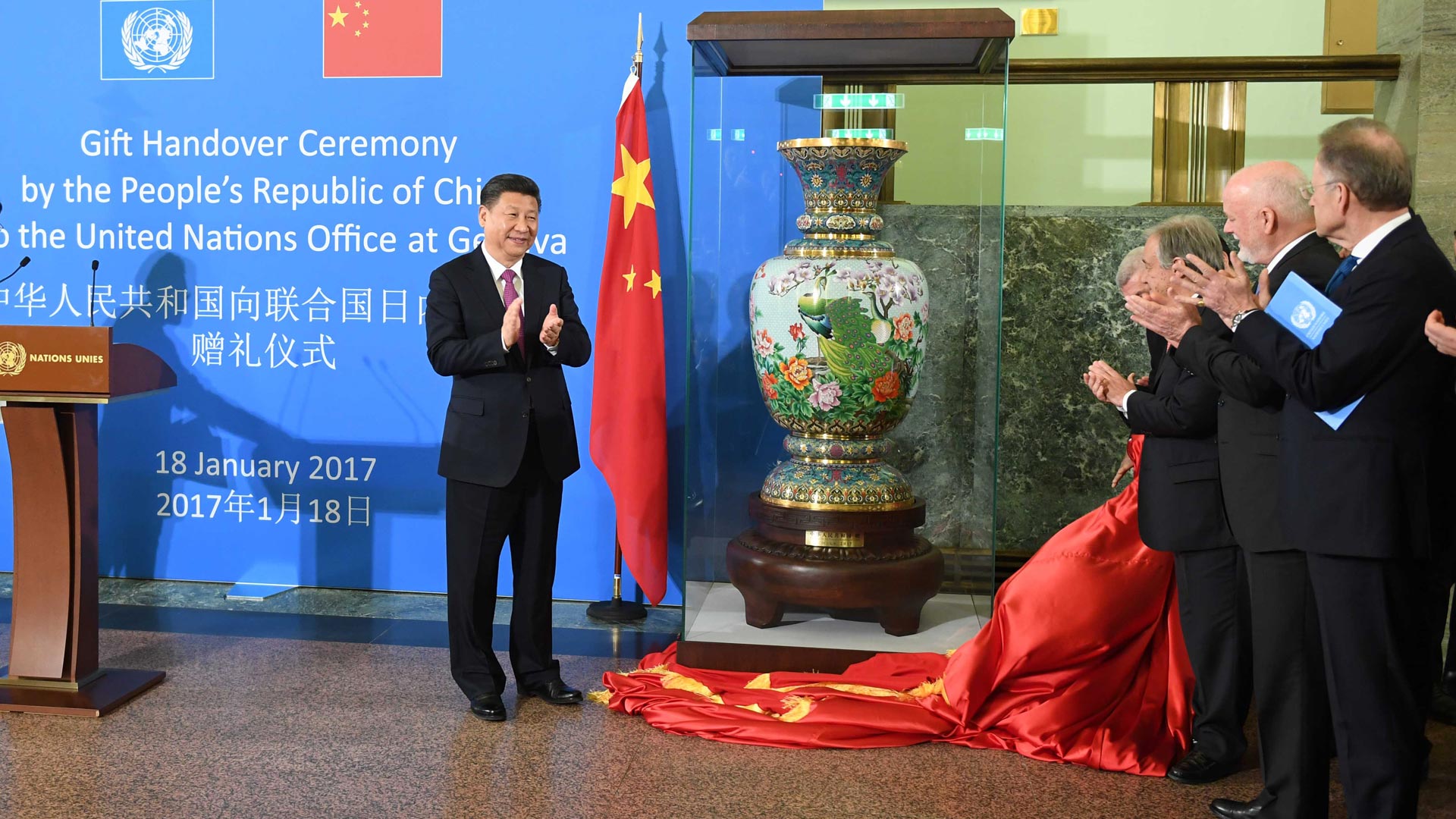 1月18日,國(guó)家主席習(xí)近平在瑞士日內(nèi)瓦萬(wàn)國(guó)宮出席“共商共筑人類命運(yùn)共同體”高級(jí)別會(huì)議,并發(fā)表題為《共同構(gòu)建人類命運(yùn)共同體》的主旨演講。這是會(huì)議結(jié)束后,習(xí)近平出席中國(guó)向聯(lián)合國(guó)日內(nèi)瓦總部贈(zèng)禮儀式。新華社記者 張鐸 攝2017-01-19