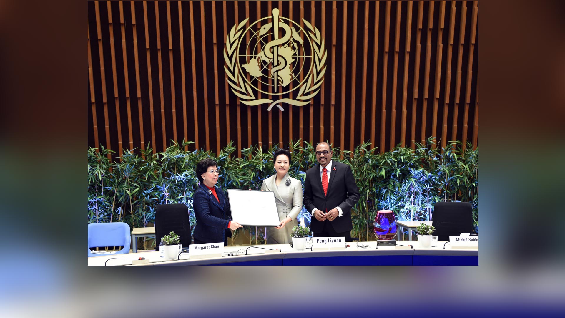 1月18日,國(guó)家主席習(xí)近平夫人、世界衛(wèi)生組織結(jié)核病和艾滋病防治親善大使彭麗媛應(yīng)世界衛(wèi)生組織總干事陳馮富珍和聯(lián)合國(guó)艾滋病規(guī)劃署執(zhí)行主任西迪貝邀請(qǐng),在瑞士日內(nèi)瓦出席為她舉行的親善大使任期續(xù)延暨頒獎(jiǎng)儀式。這是世界衛(wèi)生組織總干事陳馮富珍向彭麗媛頒發(fā)世衛(wèi)組織榮譽(yù)勛章。新華社記者謝環(huán)馳攝2017-01-19