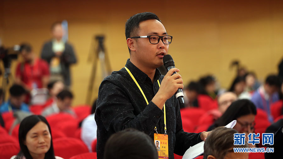 10月22日,十九大新聞中心在梅地亞中心二層新聞發(fā)布廳舉辦集體采訪活動,邀請教育領(lǐng)域代表談“教育綜合改革”。圖為新京報記者提問。新華網(wǎng) 郝廣鵬攝