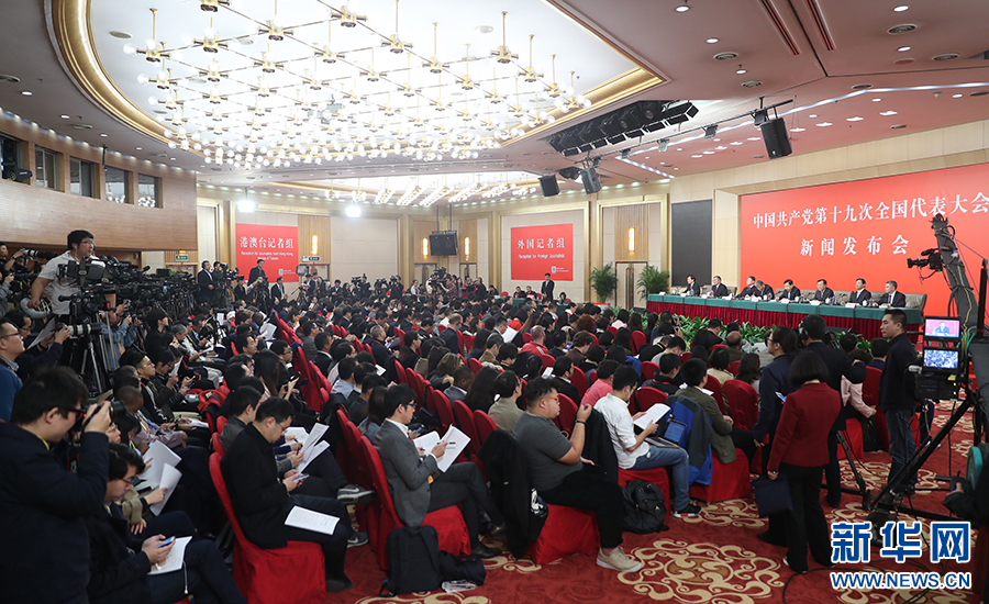 10月26日上午10:00,中國(guó)共產(chǎn)黨第十九次全國(guó)代表大會(huì)新聞發(fā)言人在梅地亞賓館二層新聞發(fā)布廳召開(kāi)專(zhuān)題新聞發(fā)布會(huì),請(qǐng)有關(guān)方面負(fù)責(zé)人解讀十九大報(bào)告,并回答記者關(guān)心的問(wèn)題。圖為新聞發(fā)布會(huì)現(xiàn)場(chǎng)。新華網(wǎng) 王翰林 攝