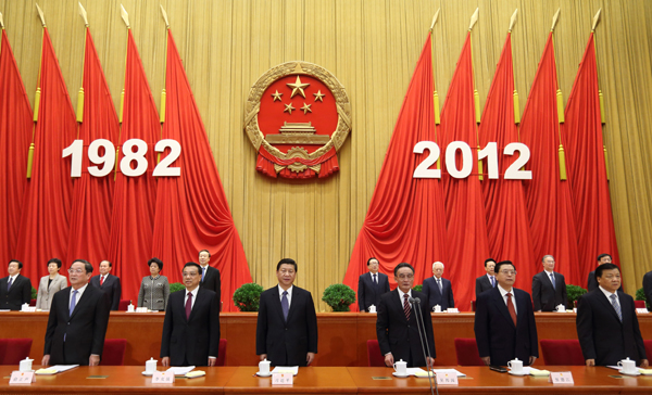 ??? 12月4日,首都各界在北京人民大會堂集會,隆重紀(jì)念現(xiàn)行憲法公布施行三十周年。習(xí)近平、吳邦國、李克強、張德江、俞正聲、劉云山等出席大會。新華社記者蘭紅光攝