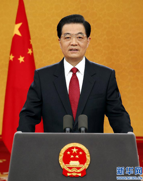 ????新年鐘聲就要敲響,2013年即將來臨。我很高興通過中國(guó)國(guó)際廣播電臺(tái)、中央人民廣播電臺(tái)和中央電視臺(tái),向全國(guó)各族人民,向香港特別行政區(qū)同胞和澳門特別行政區(qū)同胞,向臺(tái)灣同胞和海外僑胞,向世界各國(guó)和各地區(qū)的朋友們,致以新年的祝福!