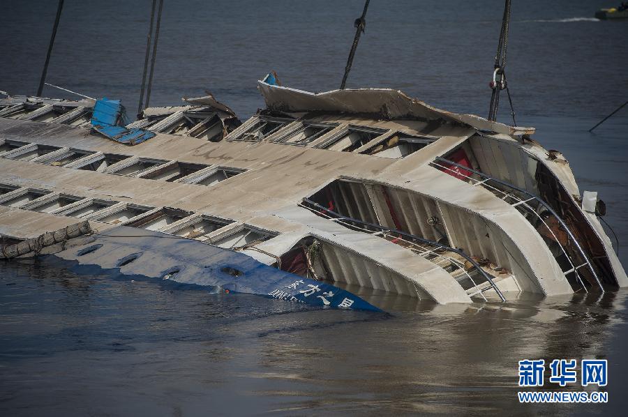 “東方之星”號游輪正在被扶正(6月5日攝)。當(dāng)天8時(shí)30分左右,“東方之星”沉船正在被扶正,已露出頂部及四層和三層。 。 新華社記者 肖藝九 攝