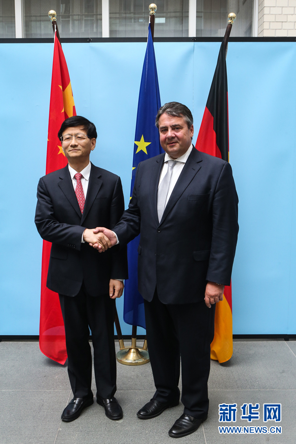 ?? ?6月29日,習(xí)近平主席特使、中共中央政治局委員、中央政法委書記孟建柱(左)在德國首都柏林會見德國副總理兼經(jīng)濟(jì)和能源部長加布里爾。新華社記者張帆攝