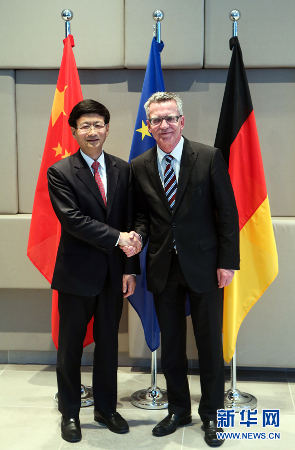 新華社照片,柏林,2015年6月30日 (XHDW)孟建柱會(huì)見(jiàn)德國(guó)內(nèi)政部長(zhǎng)德邁齊埃 6月29日,習(xí)近平主席特使、中共中央政治局委員、中央政法委書(shū)記孟建柱(左)在德國(guó)首都柏林會(huì)見(jiàn)德國(guó)內(nèi)政部長(zhǎng)德邁齊埃。 新華社記者張帆攝