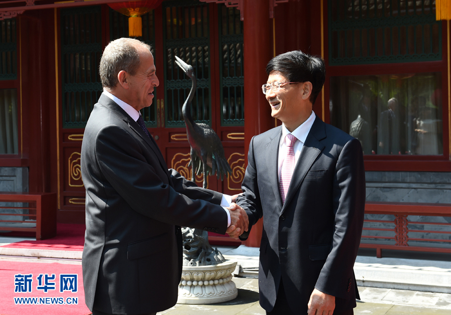 ??? 9月7日,中共中央政治局委員、中央政法委書記孟建柱在釣魚臺(tái)國賓館會(huì)見由主席佩里率領(lǐng)的英國48家集團(tuán)俱樂部代表團(tuán)。 新華社記者張領(lǐng)攝