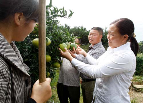 圖為四川成都蒲江縣西來鎮(zhèn)兩河村支書姚慶英關(guān)心村民的柑橘生產(chǎn)。王若冰攝