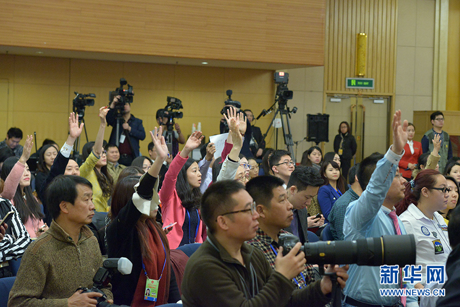 ????3月13日上午10時(shí),十二屆全國人大三次會(huì)議新聞中心邀請四川大學(xué)校長謝和平、江蘇省教育廳廳長沈健、廣東省教育廳廳長羅偉其、海南大學(xué)校長李建保、貴州大學(xué)校長鄭強(qiáng)就完善高等教育治理結(jié)構(gòu)的相關(guān)問題回答中外記者提問。圖為現(xiàn)場記者踴躍提問。新華網(wǎng)/中國政府網(wǎng) 郭小天 攝